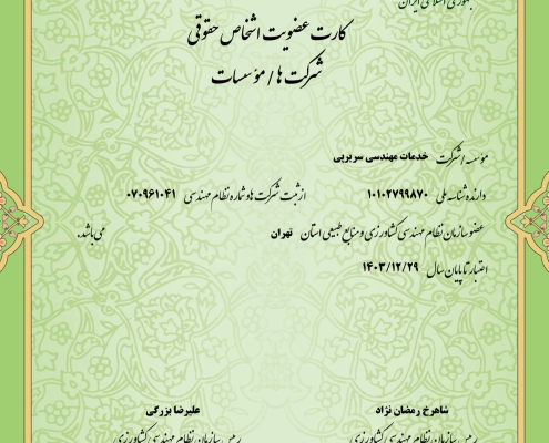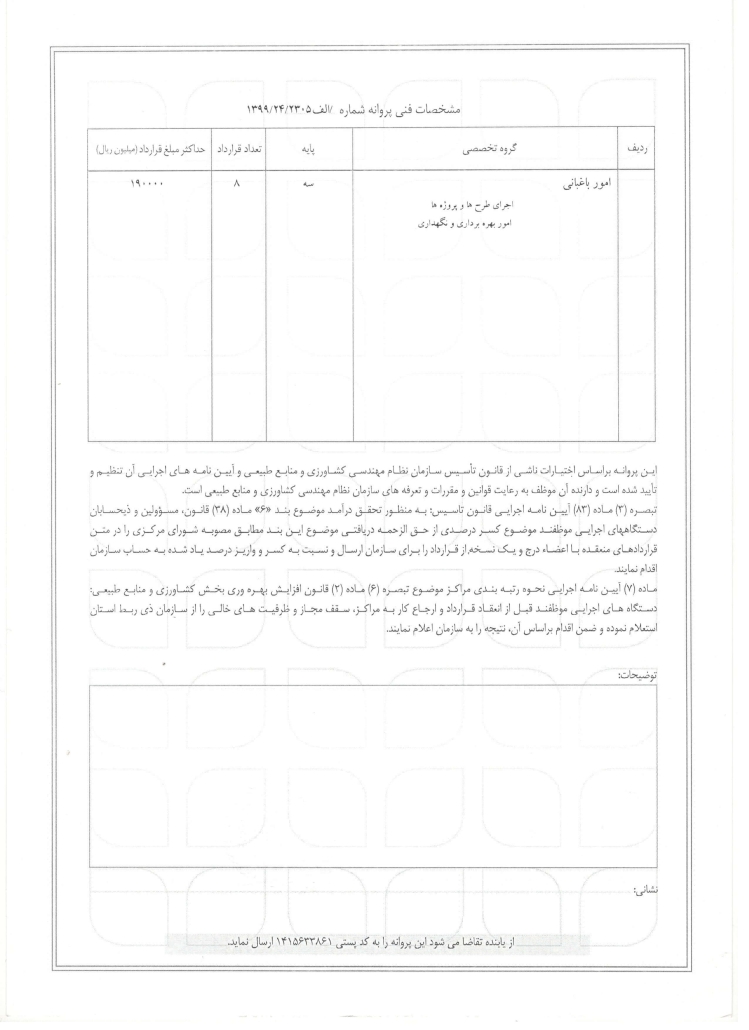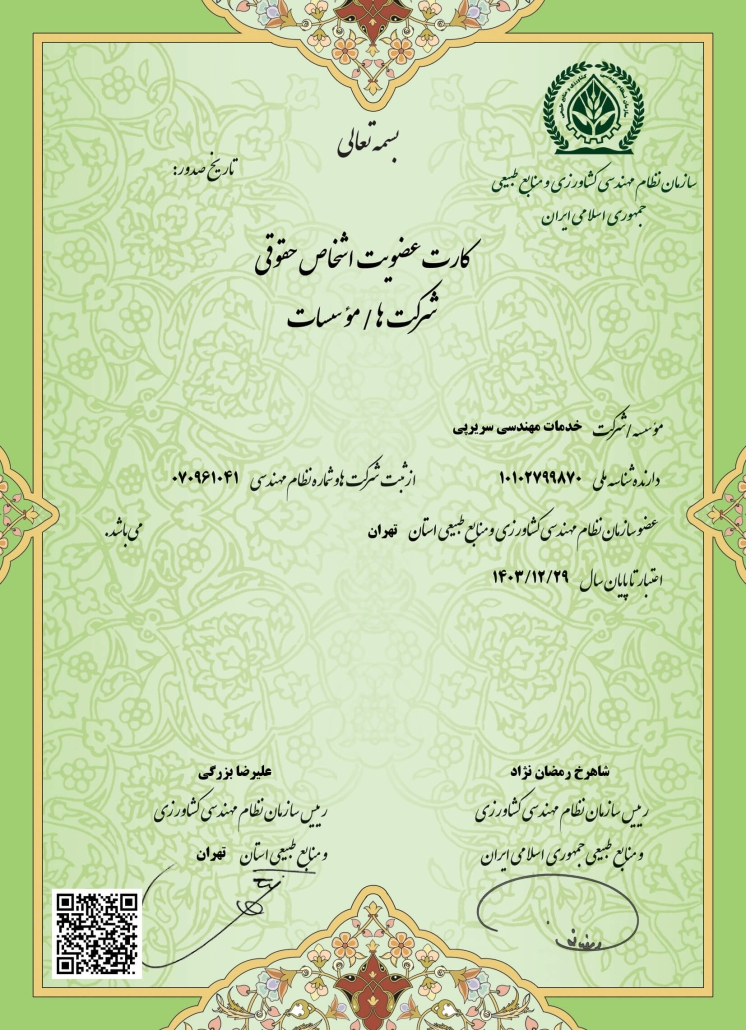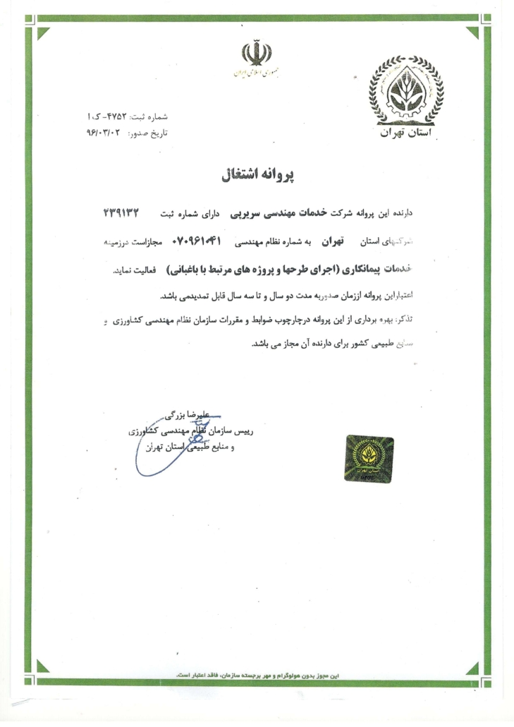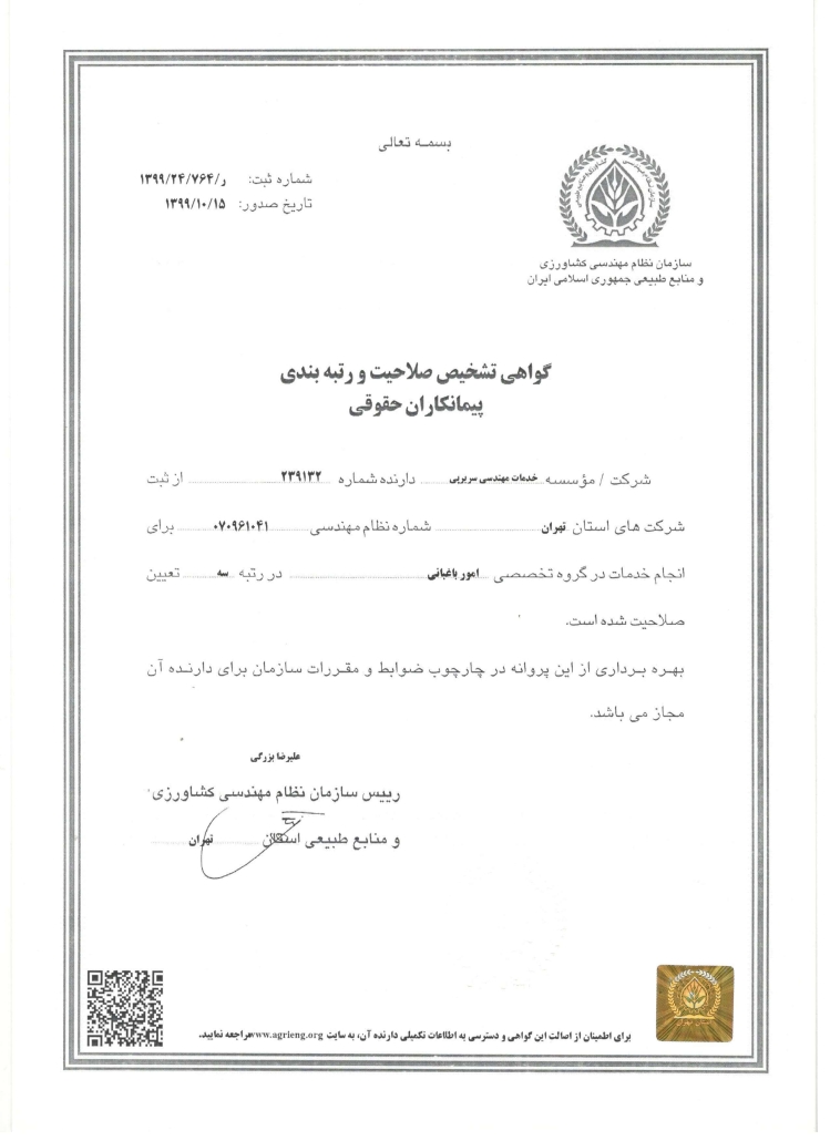 هم اکنون این شرکت دارای رتبه 3 در رشته ساختمان و ابنیه، رتبه 4 در رشته تاسیسات و تجهیزات ، رتبه 5 در رشته راه و ترابری و رتبه 5 در رشته آب از سازمان برنامه و بودجه کشور و رتبه 3 در رشته باغبانی(گلخانه) از سازمان نظام مهندسی کشاورزی و منابع طبیعی استان تهران می باشد.